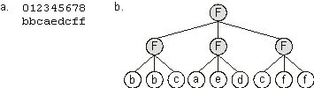 a) A chromosome composed of nine one-element genes. b) The one-element sub-ETs posttranslationally linked by a three-argument function “F”.