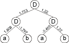 "D" represents a function with connectivity two. This function multiplies the value of each argument by its respective weight and adds all the incoming activation in order to determine the forwarded output. This output (0 or 1) depends on the threshold which, for simplicity, was set to 1.