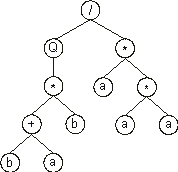 Its expression as an ET is also very simple and straightforward. In order to express the ORF correctly, we must follow the rules governing the spatial distribution of functions and terminals. First, the start of a gene corresponds to the root of the expression tree which is placed in the topmost line. Second, in the next line, below each function, are placed as many branch nodes as there are arguments to that function. Third, from left to right, the nodes are filled consecutively with the next elements of the K-expression. Fourth, the process is repeated until a line containing only terminals is formed. In this case, the following expression tree is formed: